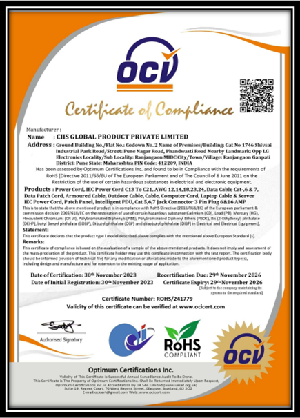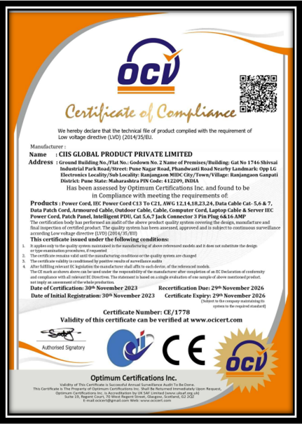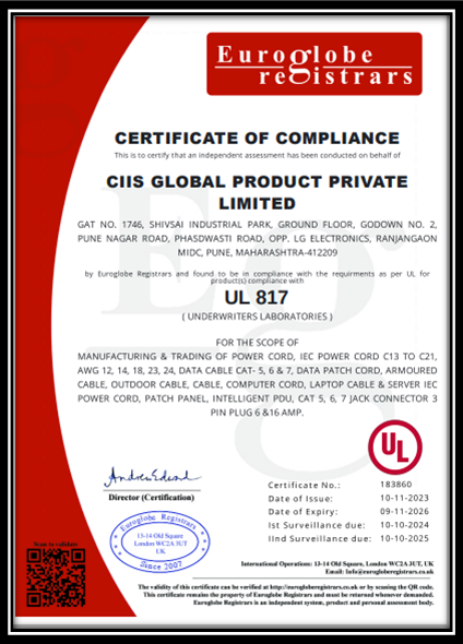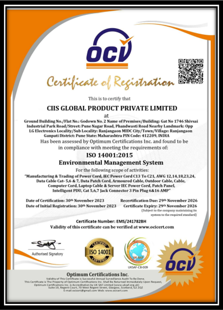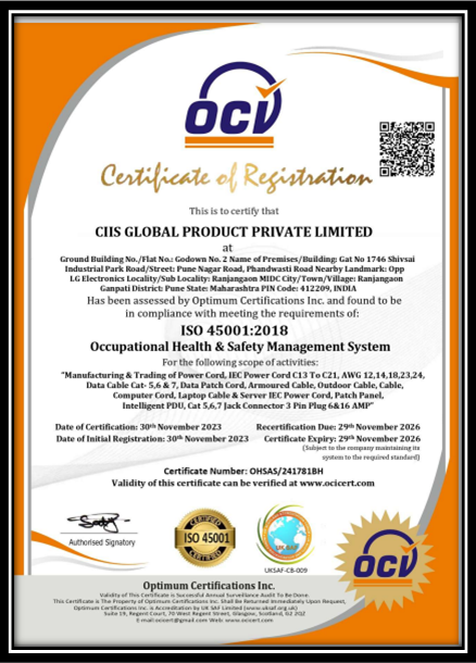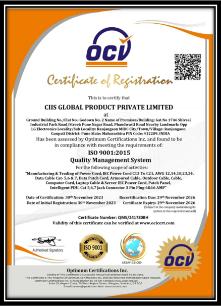 We are CIIS Global Product Private Limited is a Pune based ISO 9001:2015, 14001: 2015, 45001:2018 ,RoHS, CE,UL Compliance certified company working towards excellence in the manufacturing of total solutions in wire Products, Networking Cables, Power Cables, Audio Video Cables etc. Establishment 2016, CIIS Global priref limit is a subsidairy company of Chirag International Industrial Services.